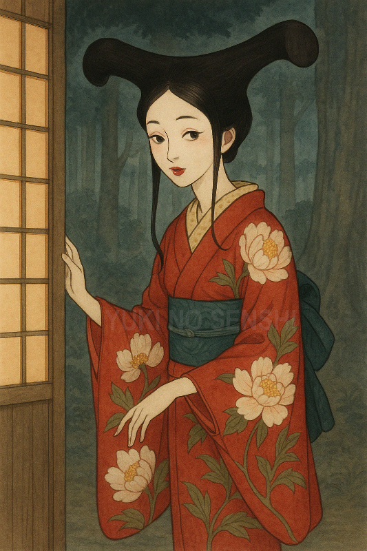 Ha grandi occhi che si estendono dai lati della testa. Indossa un kimono furisode, solitamente indossato da giovani donne non sposate.